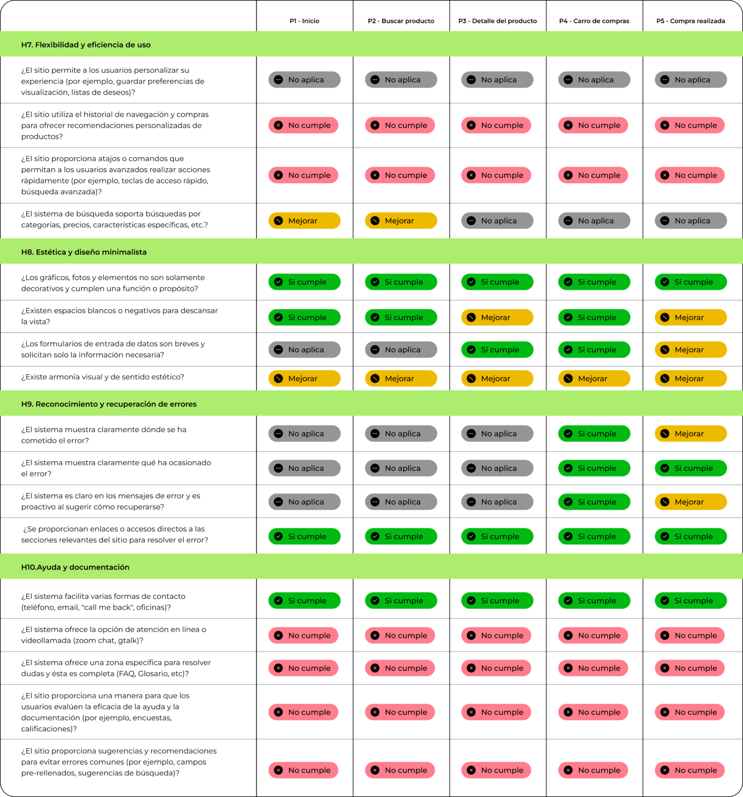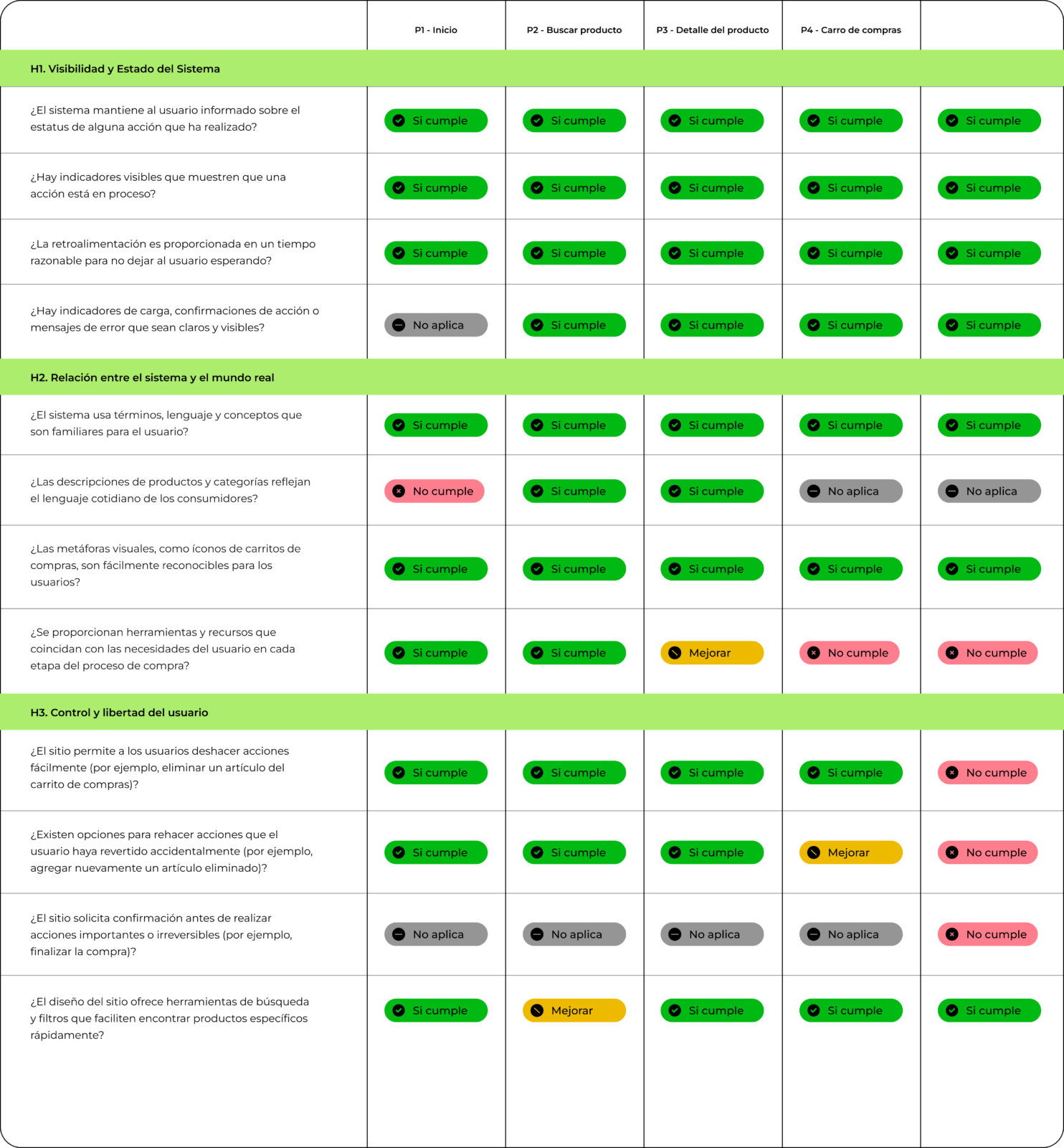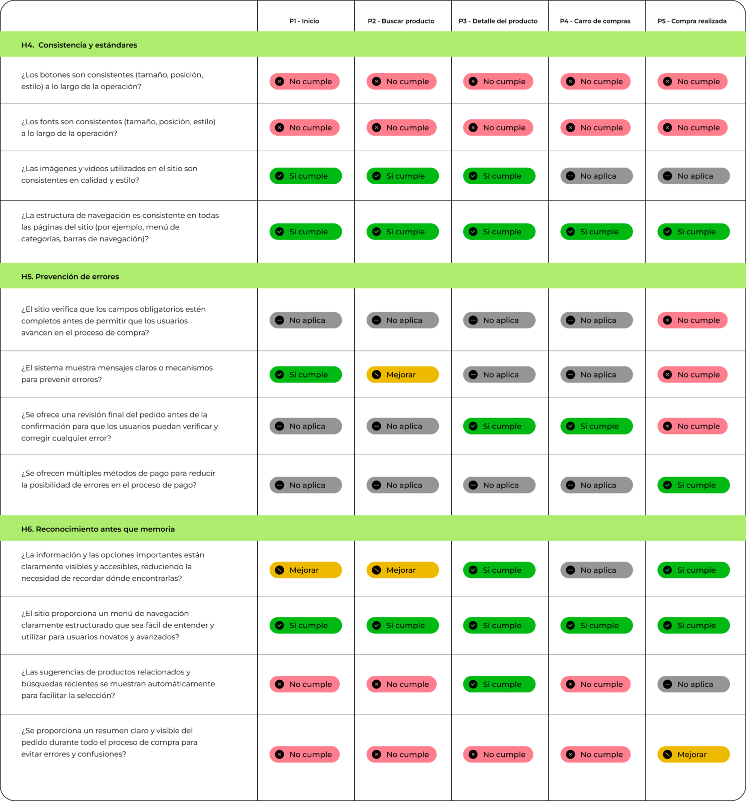 Ejemplo: Los botones para realizar acciones críticas, como completar la compra, variaban en tamaño, estilo y ubicación a lo largo del sitio, lo que hacía difícil para los usuarios identificar rápidamente cómo proceder.